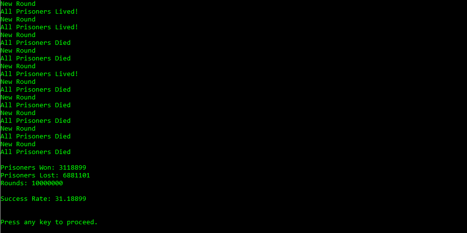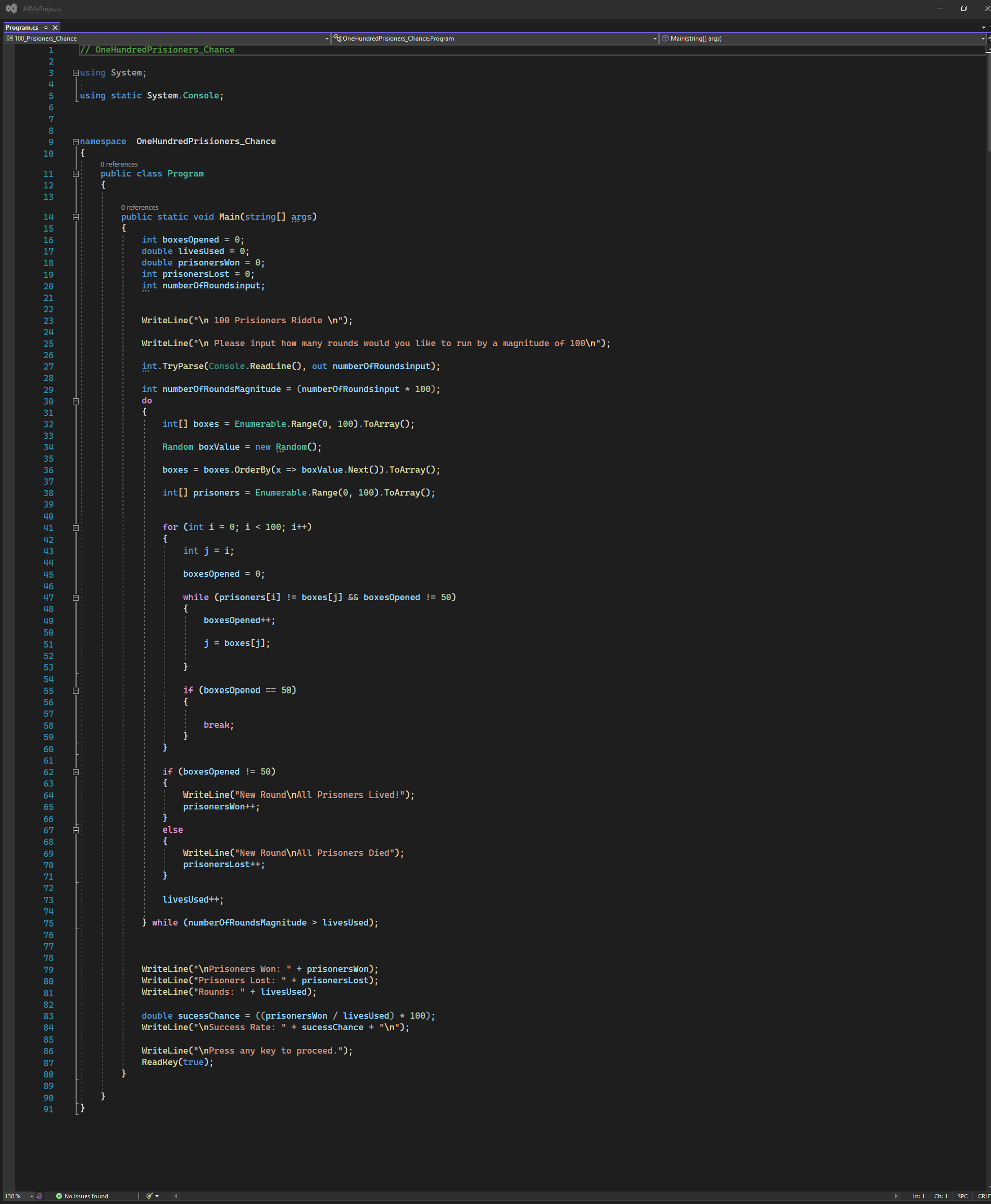 Halfway trough the video I decided to test it myself, I built this little program in a little more time than I would like to admit (about an hour), the main culprit behind the lengthiness of creating the program was forgetting to reset the '50 maximum boxes opened' counter back to 0 after each prisoner found their number. After a good amount of debugging I found my mistake, fixed it and gave it a go: