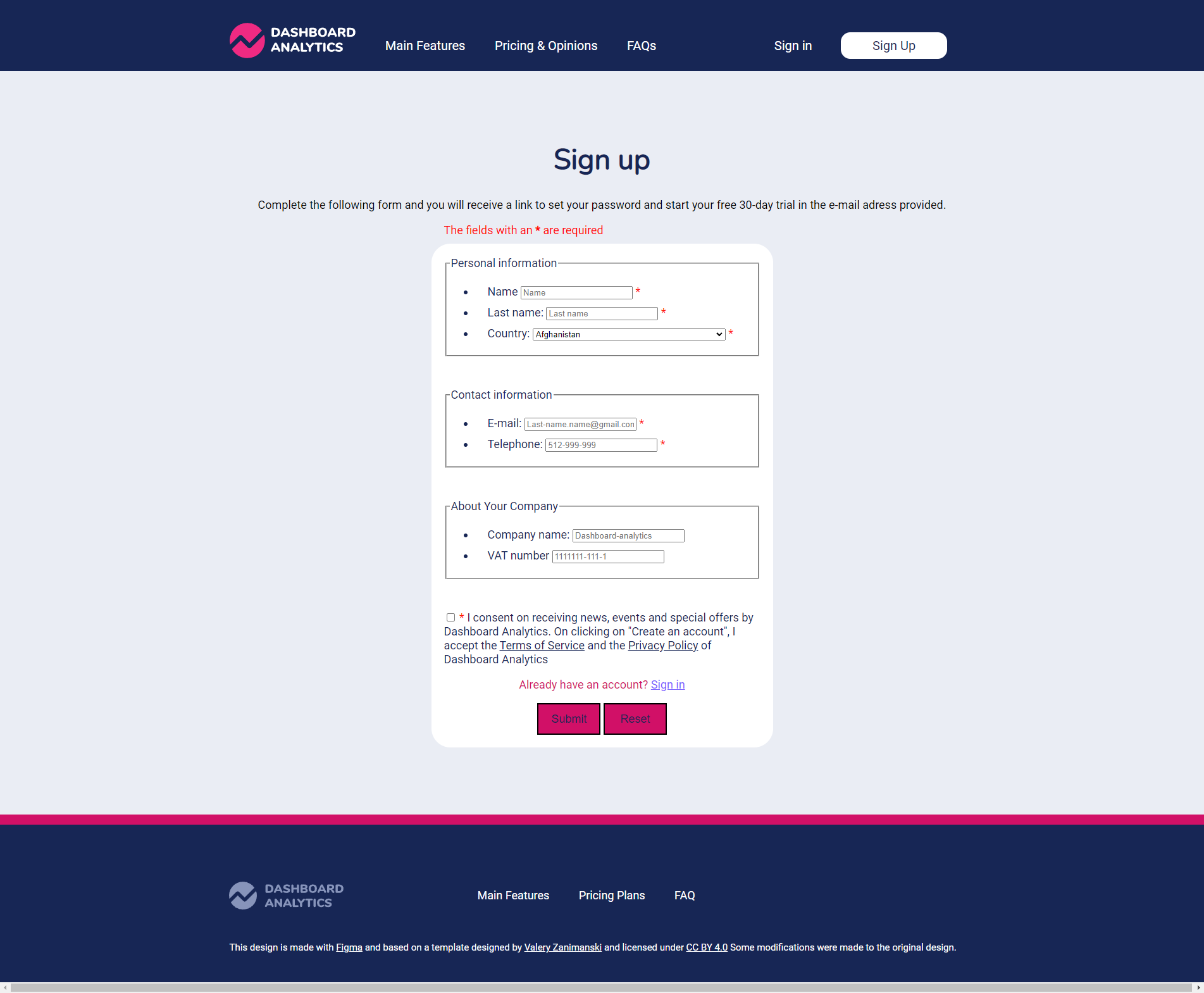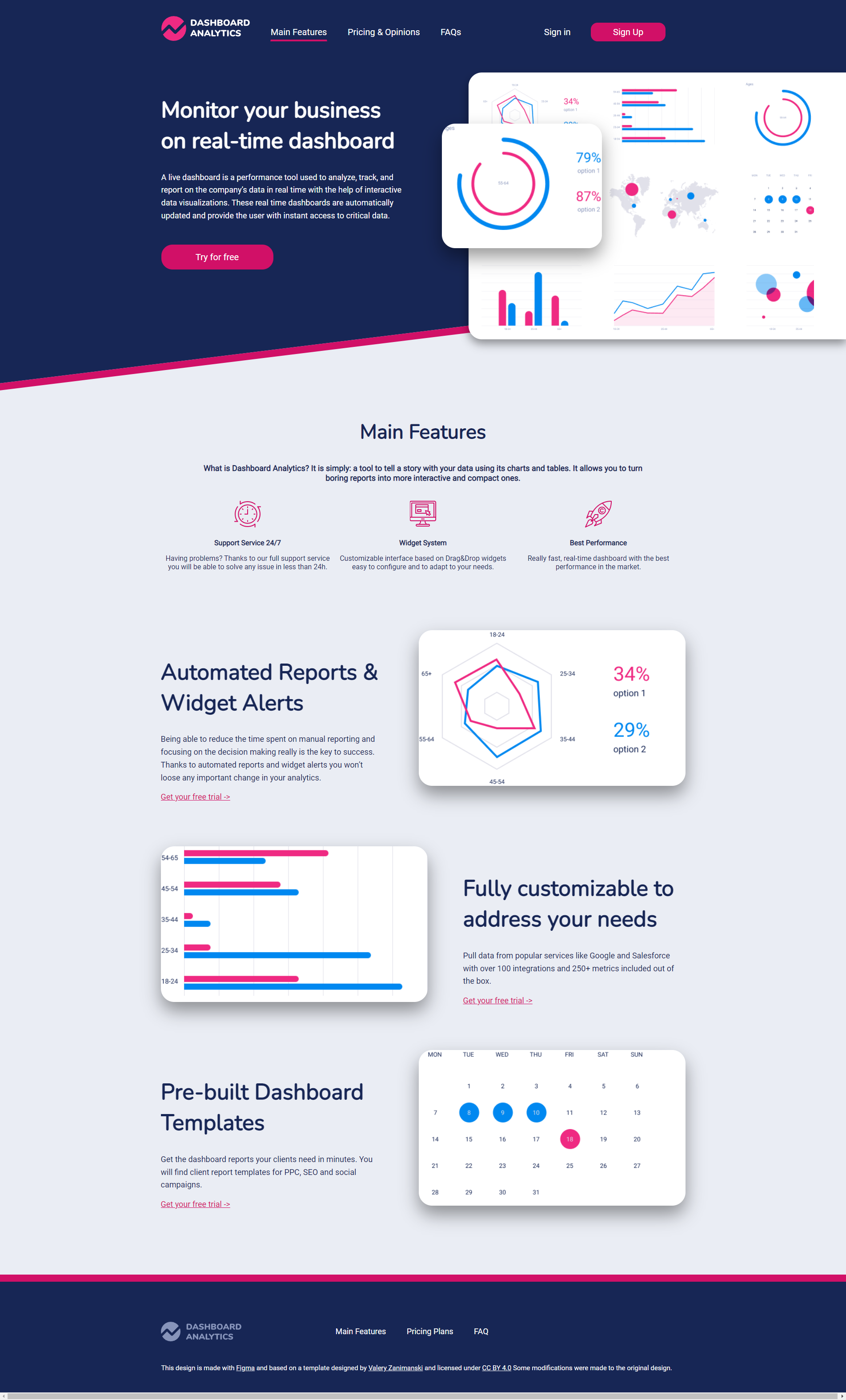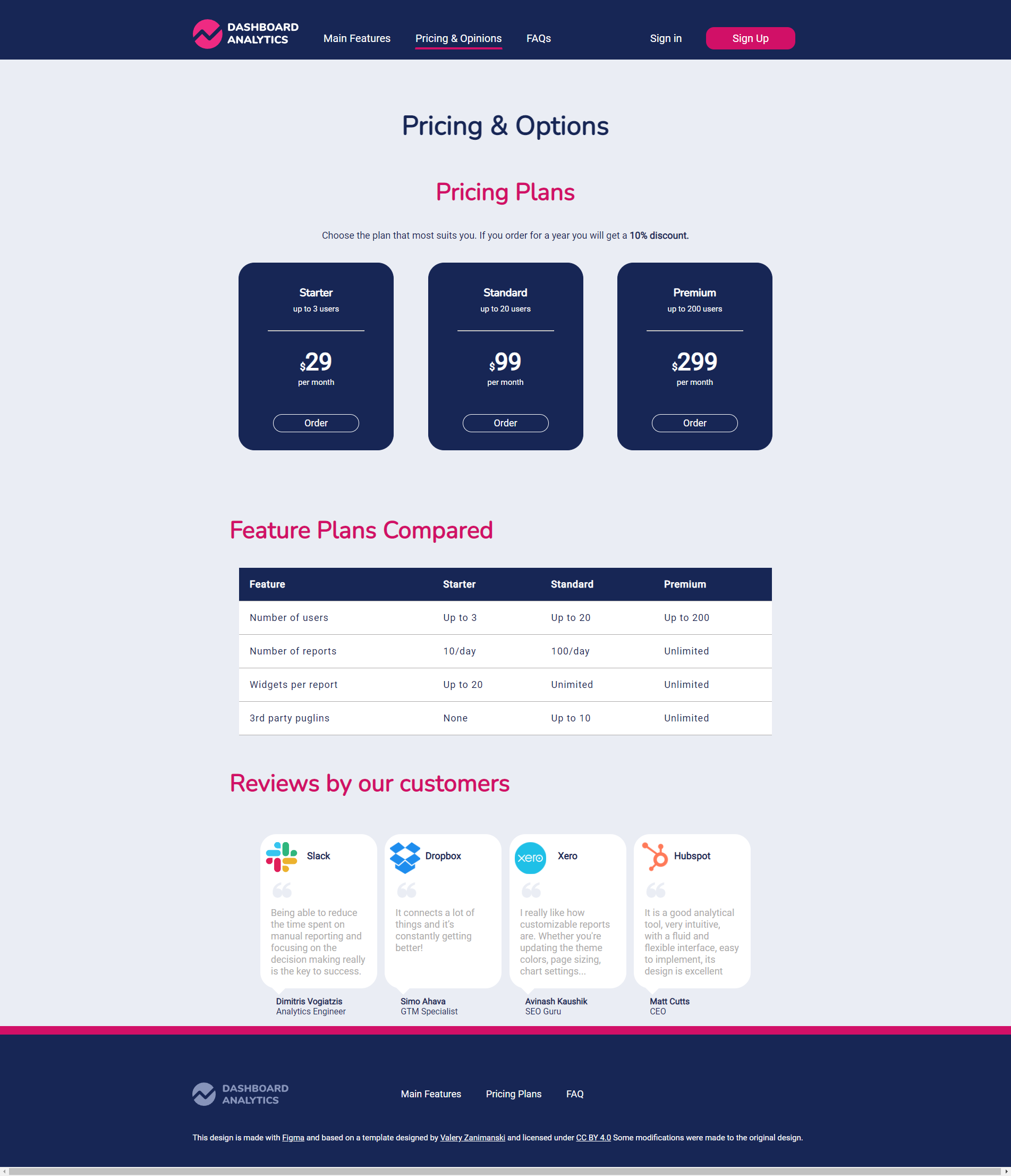 HTML & CSS Dashboard Analytics The final project required me to have the following four pages: Main Features Pricing & Option Pricing & Option (Hover on an option) FAQs Sign Up Return